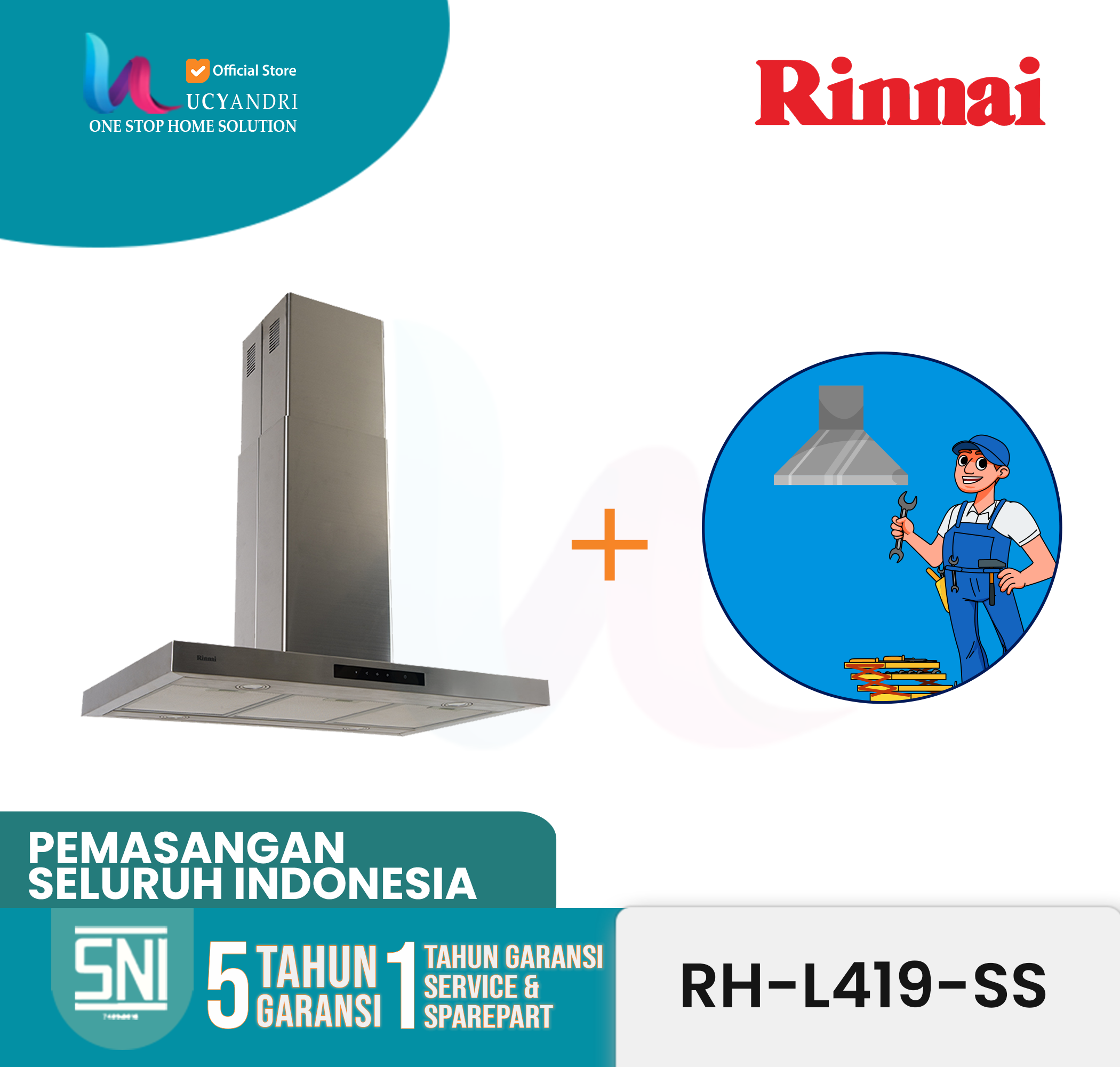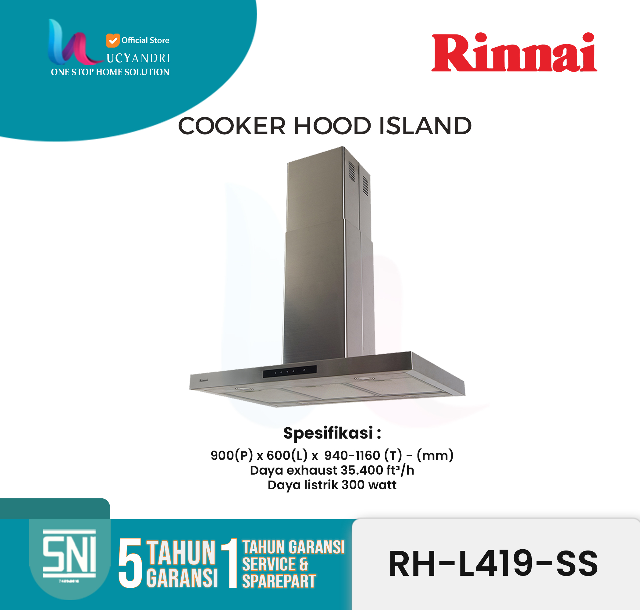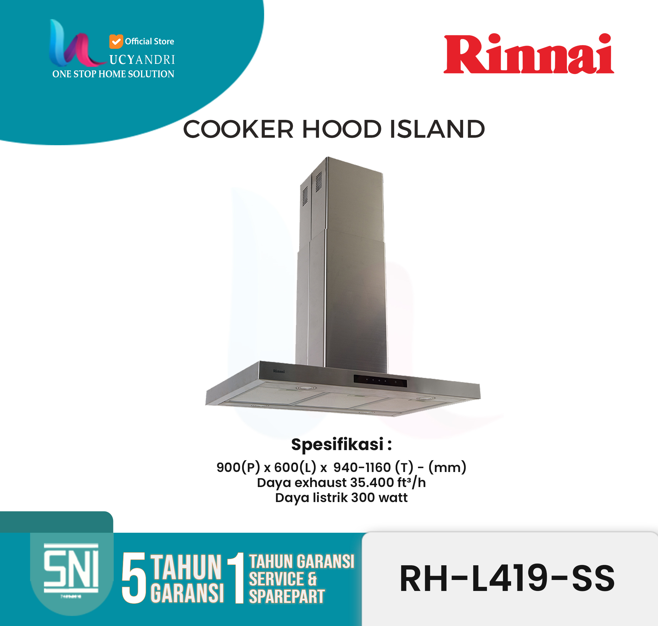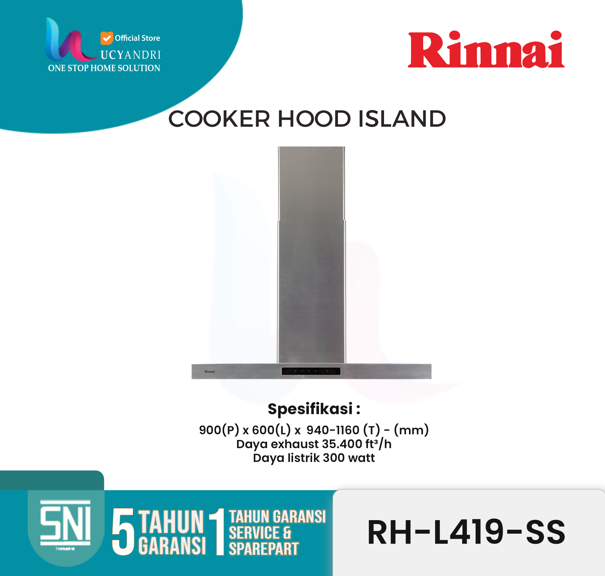 Rinnai Cooker Hood Island series RH-L419-SS penghisap asap gantung terbaik, dengan desain yang elegan dan modern. Penghisap asap gantung ini dilengkapi dengan daya exhaust sebesar 35.400 ft3/h dan low noise level 59 dB dapat menghisap asap dengan maksimal dan tidak menimbulkan suara bising. Recycle dan ventilation system yang ada pada RH-L419-SS dapat membuat asap yang telah di hisap langsung dibuang keluar dari dapur Anda atau mensirkulasi kannya. Dapur pun jadi bersih, tak berbau, dan nyaman membuat Anda leluasa berkreasi ketika memasak