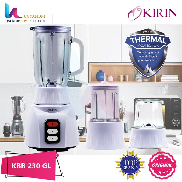 Kirin Beauty Blender KBB 230GL1 dengan kapasitas 1 L, dilengkapi dengan Dry Mill untuk menghaluskan bumbu kering, dan Wet Mill untuk menghaluskan bumbu basah, dengan pisau stainless steel yang kuat dan anti karat, dan wadah blender berbahan kaca yang higienis.