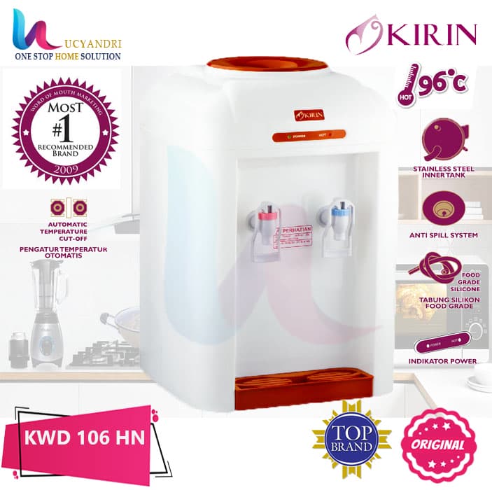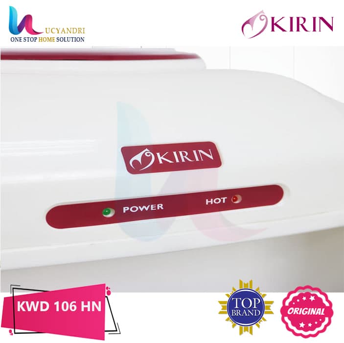 “Kirin Water Dispenser KWD 106HN, dispenser air yang dilengkapi dengan dua pilihan jenis air yaitu normal dan panas.Body dispenser terbuat dari bahan plastik yang aman dan kuat, sedangkan untuk tangki air di dalamnya menggunakan bahan stainless steel sehingga dispenser awet dan tahan lama dengan kapasitas 0,6Liter, dilengkapi dengan tombol ON/OFF untuk mengatur ketika air panas akan dinyalakan atau dimatikan.