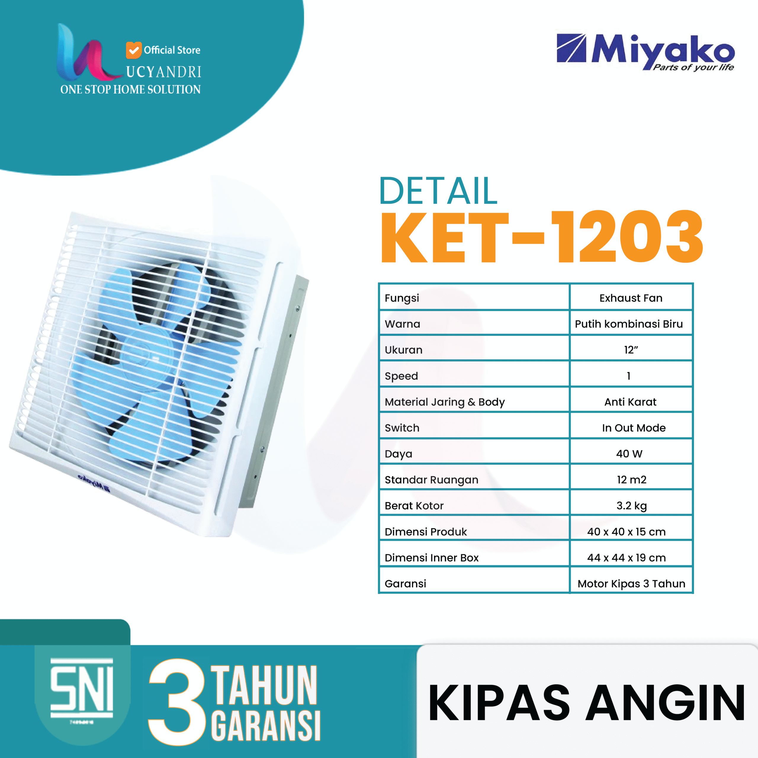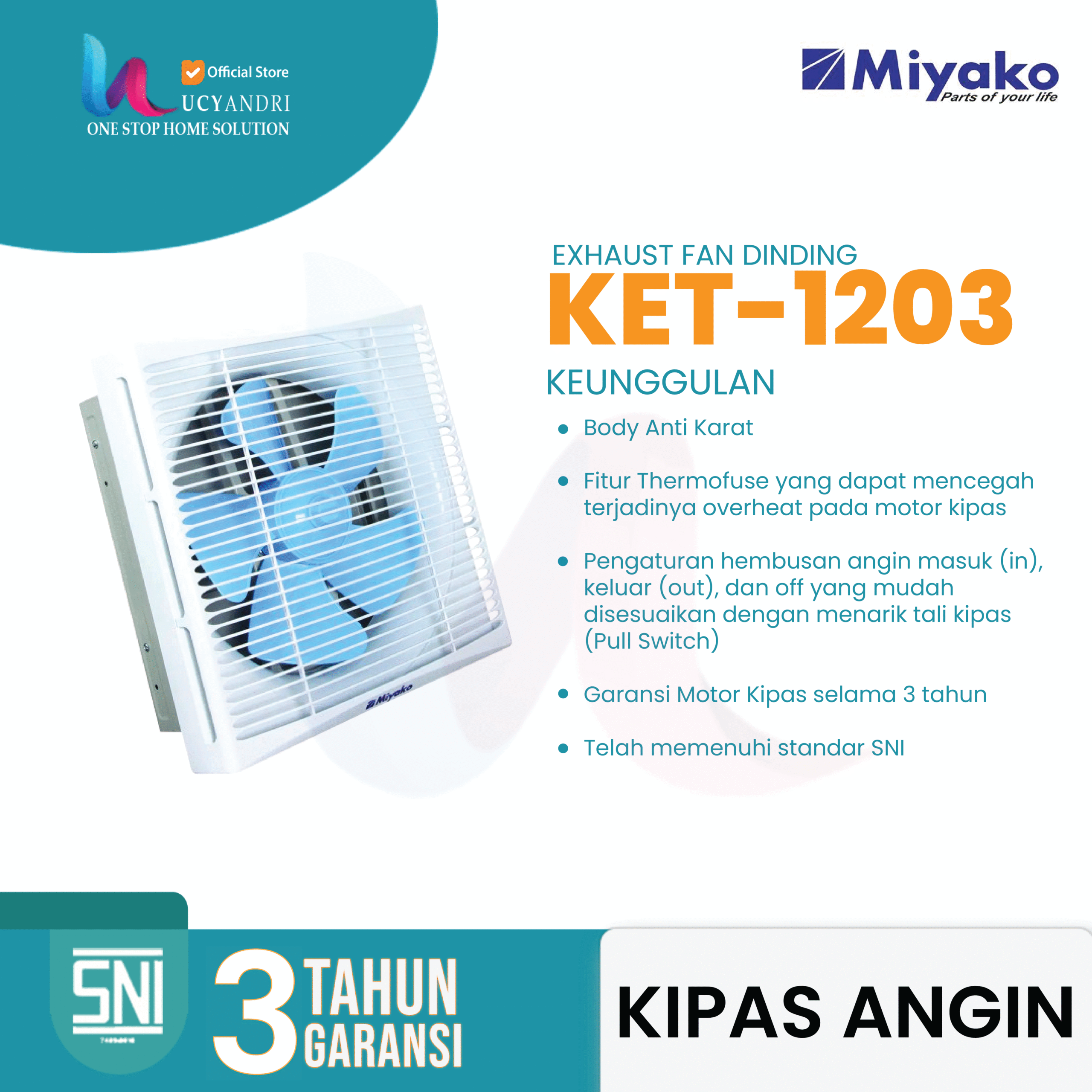 Miyako Exhaust Fan Dinding KET-1203 adalah kipas ventilasi dinding berkualitas tinggi yang dirancang untuk menjaga sirkulasi udara tetap bersih dan segar di dalam ruangan. Cocok dipasang di dapur, kamar mandi, ruang kerja, atau ruangan lain yang cenderung lembap dan panas. Dengan performa motor kuat namun hemat daya, serta ukuran ideal 12 inch, KET-1203 mampu menyedot udara panas dan bau tak sedap secara efisien. Desain modern, ringan, dan mudah dipasang menjadikan produk ini pilihan tepat untuk rumah tangga maupun komersial.