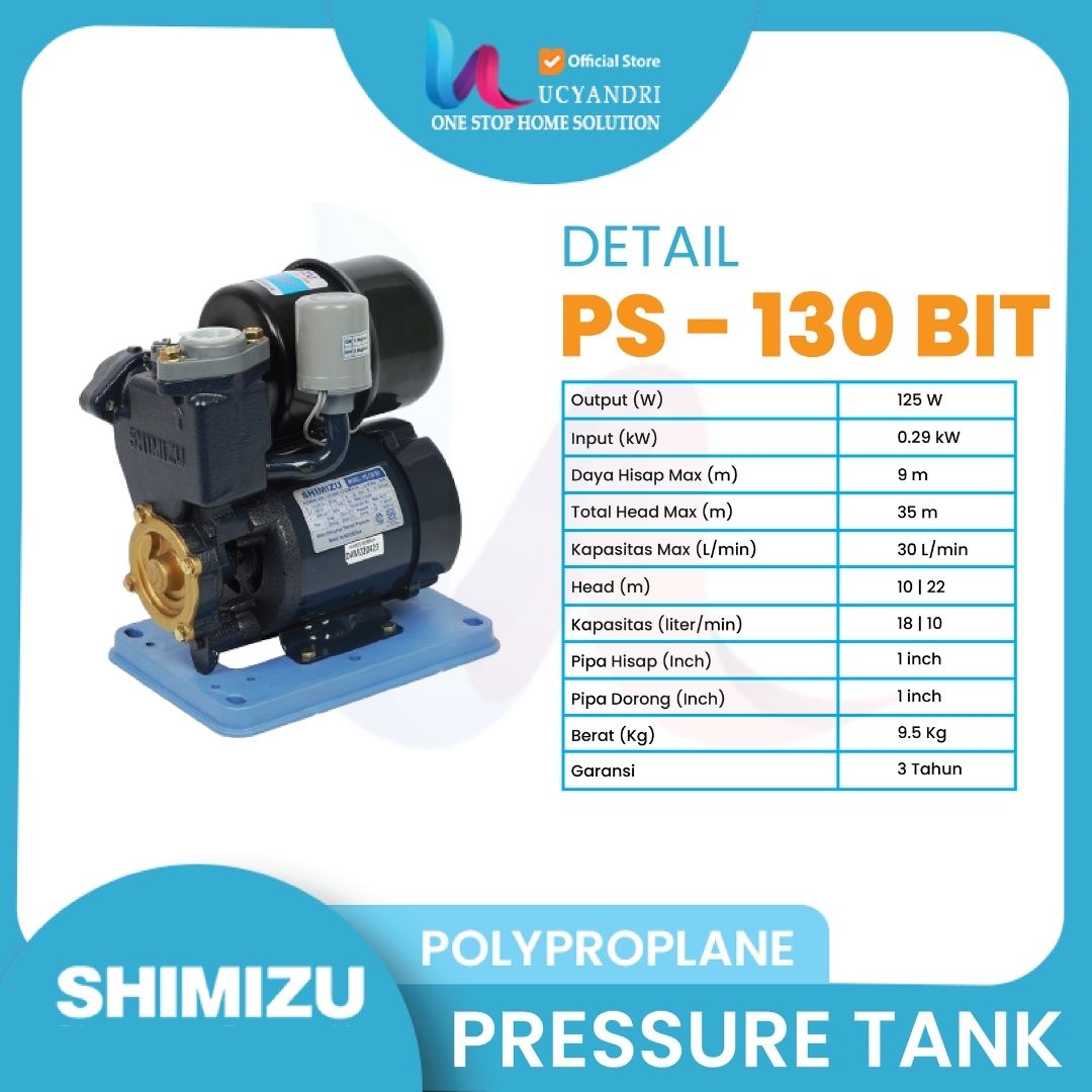 Pompa Air Shimizu PS-130 BIT adalah pompa air sumur dangkal non otomatis dengan daya listrik rendah hanya 125 Watt, cocok untuk kebutuhan air bersih di rumah tangga. Efisien, awet, dan ideal untuk rumah 1–2 lantai dengan sumber air dari sumur dangkal.