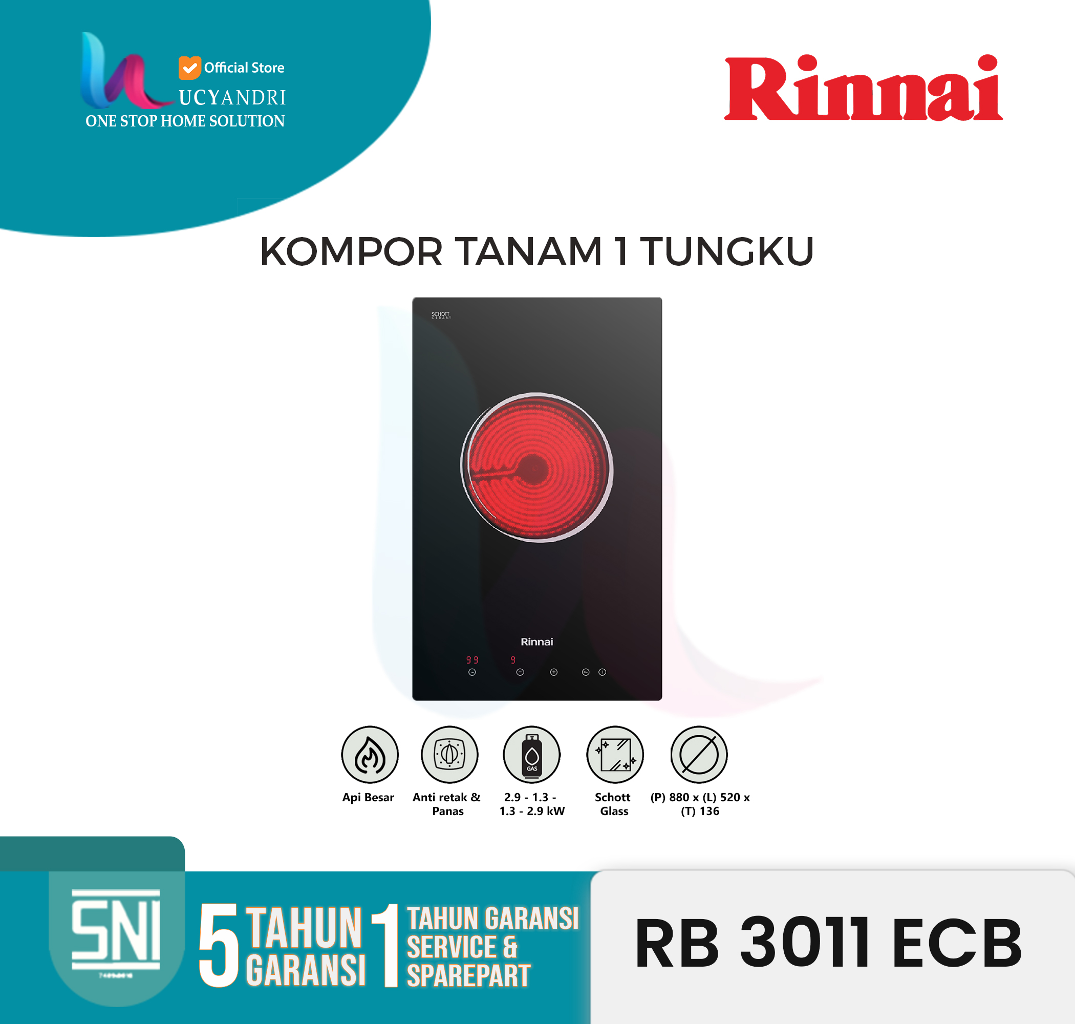 Lengkapi dapur modern Anda dengan RINNAI RB3011ECB, kompor tanam listrik 1 tungku dengan teknologi vitroceramic yang dirancang untuk efisiensi, keamanan, dan estetika dapur masa kini. Dibekali dengan permukaan kaca Schott Ceran® dari Jerman, kontrol sentuh (touch control) yang sensitif, dan fitur keamanan pintar seperti child lock dan auto-off, kompor ini memberikan pengalaman memasak yang cepat, aman, dan nyaman. Cocok untuk Anda yang tinggal di apartemen, rumah minimalis, atau membutuhkan kompor tambahan yang hemat tempat namun tetap bertenaga.