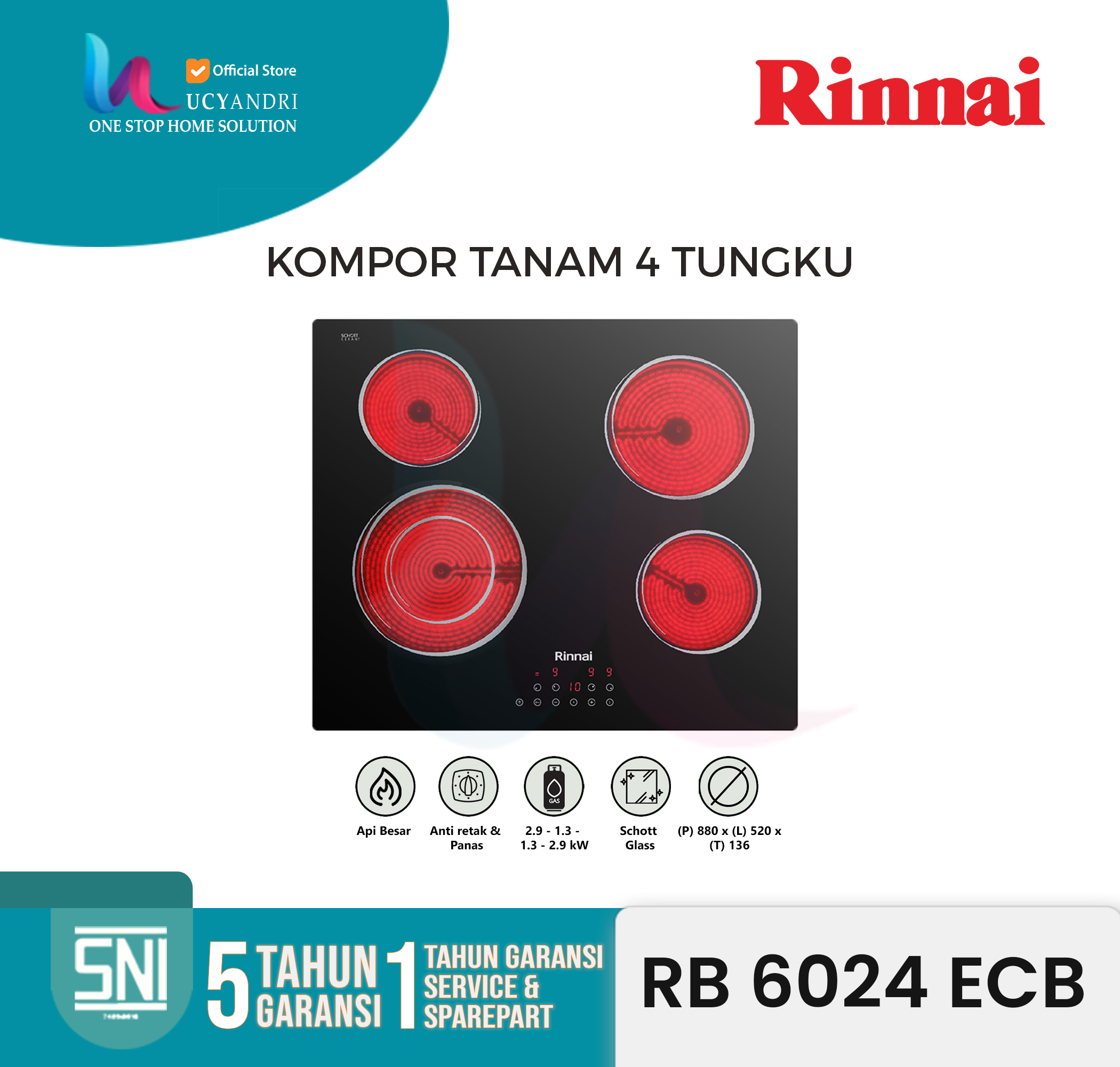 Nikmati kenyamanan memasak yang lebih praktis dan efisien dengan Rinnai RB-6024ECB, kompor tanam listrik induksi 2 tungku yang dirancang untuk dapur modern. Dilengkapi dengan permukaan kaca Schott Ceran® berkualitas tinggi yang tahan panas dan mudah dibersihkan, serta teknologi induksi yang cepat dan hemat energi. Panel kontrol sentuh yang intuitif memudahkan pengaturan panas dengan presisi, dilengkapi dengan fitur keamanan lengkap seperti child lock, auto-off, dan indikator panas sisa. Kompor ini cocok untuk kamu yang menginginkan dapur minimalis tapi fungsional, dengan performa memasak maksimal.