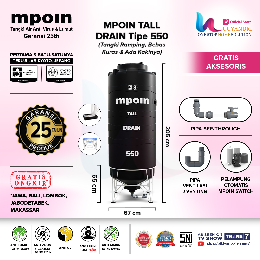 Tangki Air MPOIN DRAIN adalah tandon air bebas kuras dengan teknologi Total Flush dan Pipa Transparan (See Through Pipe) pada bagian bawah tangki sehingga mempermudah pengurasan dan pengecekan kondisi air di dalam tangki.