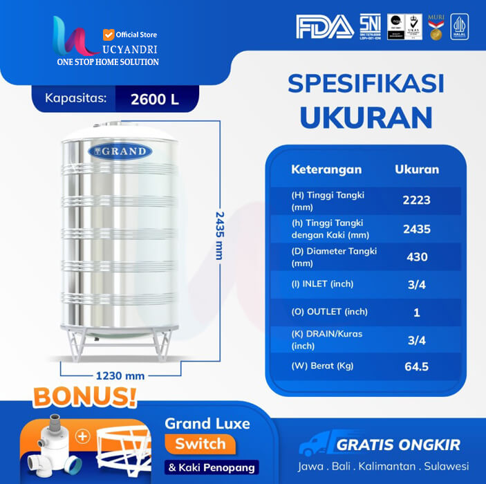 Toren Tandon Tangki Air Stainless Grand 2600 L Anti Lumut Garansi 12 Tahun