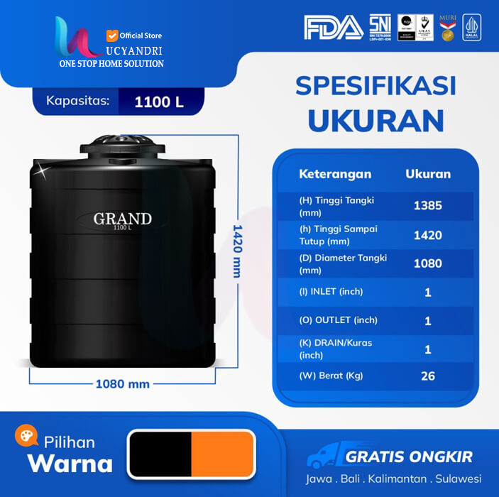 TANGKI AIR TANDON TOREN AIR GRAND GBL 1100 Vol. 1100 L TIDAK BERBAU DAN HIGIENIS Sertifikasi Halal