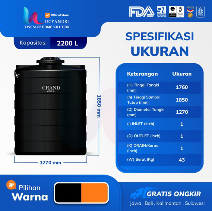 TANGKI AIR TANDON TOREN AIR GRAND GBL 2200 Vol. 2200 L TIDAK BERBAU DAN HIGIENIS Sertifikasi Halal