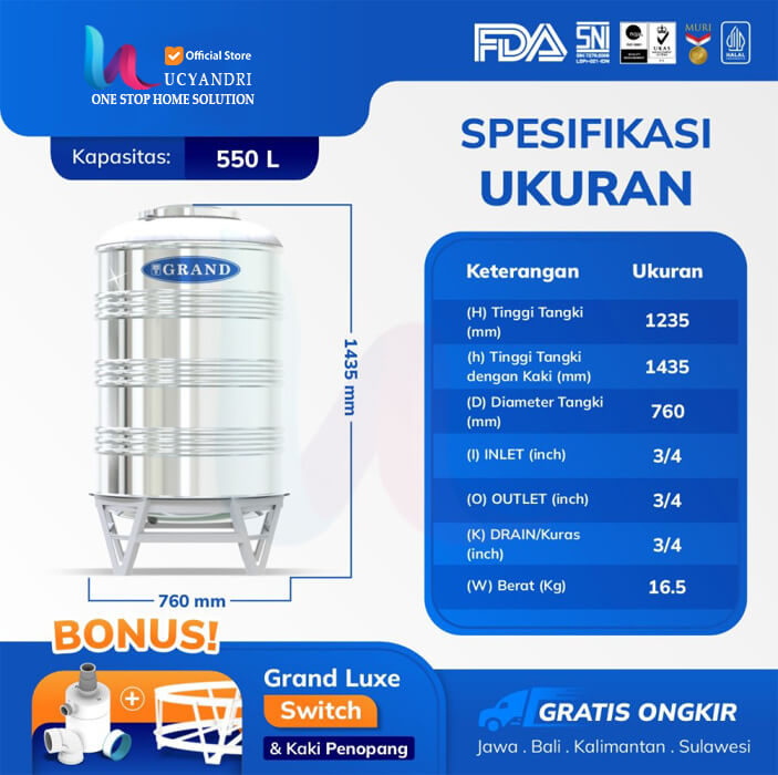 Toren Tandon Tangki Air Stainless Grand 550 L Anti Lumut Garansi 12 Tahun