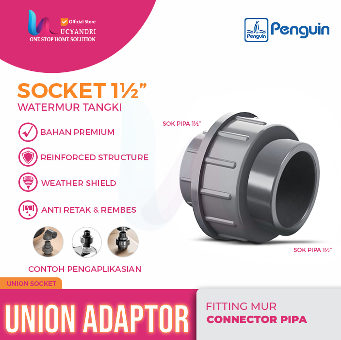 Union Adaptor Socket Penguin 1½ inch (sering disebut “watermur”) adalah fitting pipa berkualitas tinggi yang dirancang untuk menyambungkan dua bagian pipa PVC dengan sistem drat (ulir) yang presisi. Produk ini memudahkan proses pemasangan dan pembongkaran tanpa perlu menggunakan lem pipa, sehingga sangat ideal untuk instalasi air bersih, sistem irigasi, atau perpipaan rumah tangga yang memerlukan perawatan berkala.