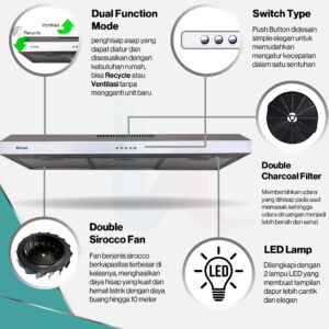 Spesifikasi: - Model / Tipe: Rinnai RHā127 SS (Slim Hood) - Dimensi (P Ć L Ć T): 695 mm Ć…
